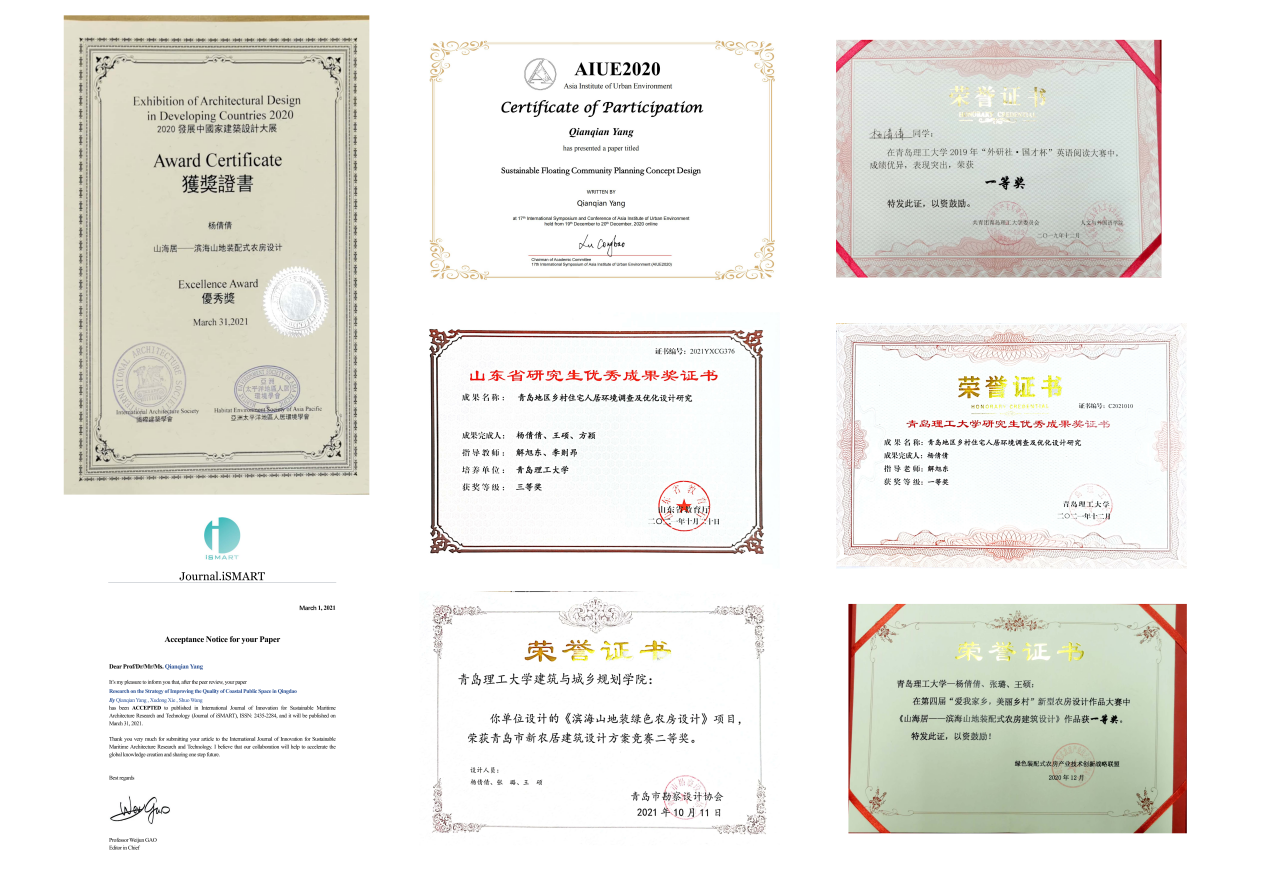 社会实践锻炼方面,积极参与导师的科研课题项目:滨海人居环境学术创新中心开放基金项目,山东省软科学研究计划,山东省高等学校科技计划项目,山东省自然科学基金项目等。在导师团队的带领下在《济南钢城文体中心规划与建筑方案设计》、《青岛市地质博物馆建筑方案设计》、《莱芜市南北城子坡——城市更新设计》等4个实际项目得到了锻炼。参加了5个学科竞赛并获得了国家级、国际级、省级、校级等6个奖项:全国高校第四届新型农房设计大赛一等奖,2020发展中国家建筑设计大展优秀奖,青岛市新农居设计大赛二等奖等。